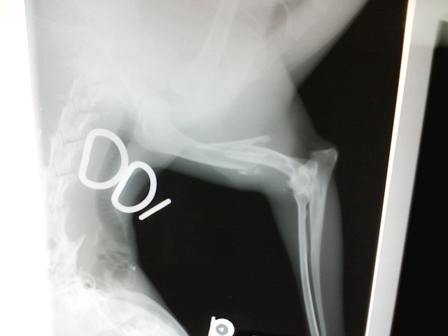 as you can see, she shattered it. He was able to put her all back together except for one piece. She has a big pen running length wise in her bone and wires holding everything together.