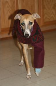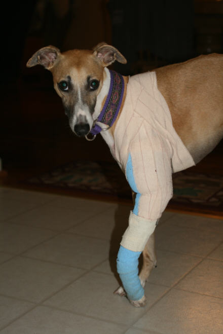 First thing in the morning I usually let the whippet girls out back to stretch their legs and relieve themselves before breakfast. On Wednesday morning I let them out for about 10 minutes and then opened the door and called them in. Paisley came first with Danica right on her heels. Paisley jumped up on the deck and spun around really fast to pounce Danica – unfortunately she thought she was still on the ground, so she went to jump off the deck (3 stairs). In mid-air she realized that Danica was already on the porch and she tried to turn in mid-air. I believe that only works for birds 🙂 She landed on her front left leg and was still in the twisting motion. She crumpled and I heard a bone break followed by Paisley screaming. This all happened in a matter of seconds and I still can’t believe it happened even though I was right there and saw the whole thing. I ran down the steps, scooped her up, placed a quick call to my vet and headed out to the car. That is when I realized that I had to go back in the house, grab Danica, turn off the stove, and grab my purse before we could leave. I felt completely helpless for a moment and must have looked dazed and confused. I was holding my dog in my arms with a dangling front leg and had no idea what to do with her so that I could run back inside. Luckily my guardian angel was watching over me and two ladies happened to be walking by at this very moment…I had never seen these ladies before and our road isn’t one that a lot of people walk on – I was delighted to see them! They asked if I needed help and I was so relieved. One of them held Paisley while I ran back inside. Within minutes I had Paisley snuggled in a bed and we were on our way. I love my vet, but it was a very long 45 minute drive! Once there, they confirmed that yes indeed it was broken (not that I had any doubt after hearing it) and that I would need to leave her there so that they could sedate her and take x-rays. They were afraid that it was in the elbow and in that case I would need to pick her back up and take her to the orthopedic surgeon. Lucky for me, it was her humerus and my vet was able to do surgery and piece her back together.