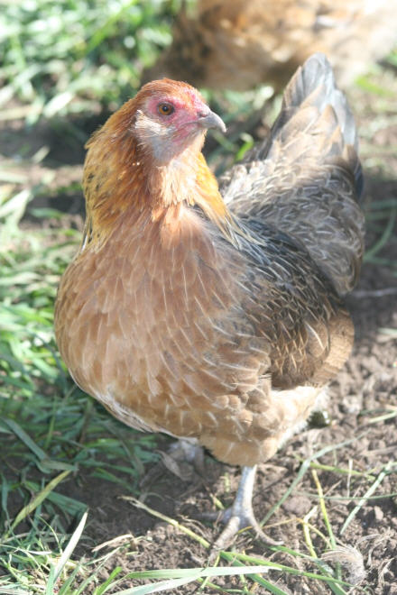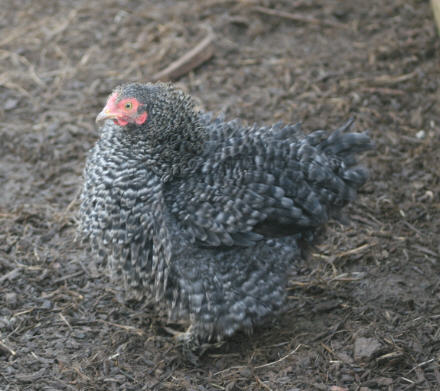 1. Pretty girls! I suspect that the sort of frizzled one is a cochin – looks like a barred rock cochin cross or something like that. She’s unusual because her feathers don’t curl outwards like a frizzle, but they’re not smooth either. Henny Penny has nice lacing – looks like she could have some partridge rock in her, and maybe some Easter Egger because she appears to have small muffs. The whole group picture shows a reddish one on the bottom left who might have Rhode Island Red or New Hampshire Red in her. The smooth feathered one in the back looks like a barred rock or Dominique cross, and the light colored one on the right might be another Easter Egger cross. Hard to tell from that angle.