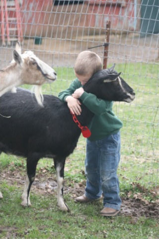 1. Your lambs are big! I have some big ones this year too. And what a precious picture of your son hugging the goat. One or two goats shouldn’t add all that much more work …just one or two?