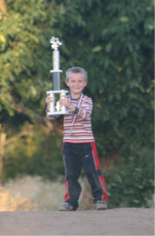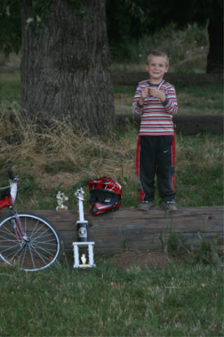 We went to the races again last night and he was excited to tell everyone that he got a new RACING bike. He is in the 5 and under division and rode in 3 races. He is very competitive and we had several discussions about good sportsmanship. He was very determined to do well and it payed off – he won 1st place! He earned a medal for his win and this trophy…