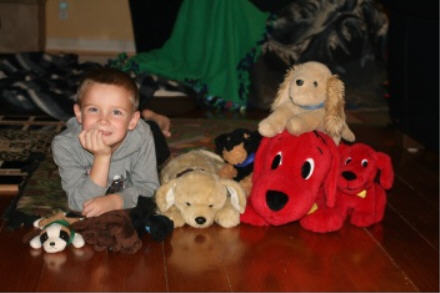 My son, who likes to pretend he is a dog, and all of his friends – Bernie, Deuce, Fetch, Major, Snook, Clifford, Clifford II, and Charlie. He doesn’t go anywhere without at least two of them. He crawls around on the floor, pants, barks, and loves to fetch his ball 🙂 Ah, to be a 5-year-old!