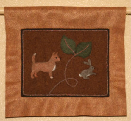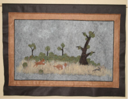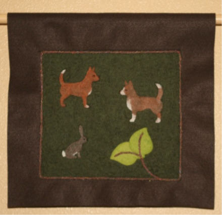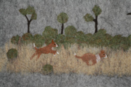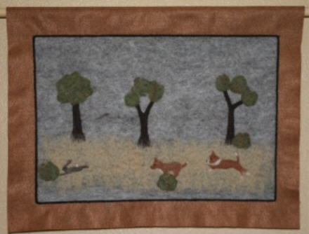 I have been working on awards for the Podengo National to be held in April. When I was first contacted they asked if I could felt a wall hanging with Podengos chasing a rabbit through the Portugal countryside.