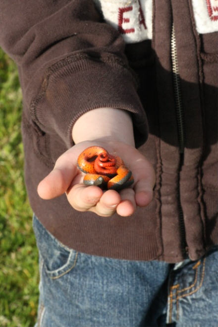 Now that the sun has come out – my son has been finding snakes everywhere. He has been setting up little traps trying to catch them without any luck. He found 5 yesterday, but I was too late to catch them – they had already crawled into the tall grass.