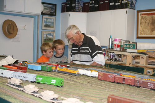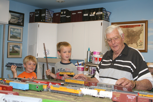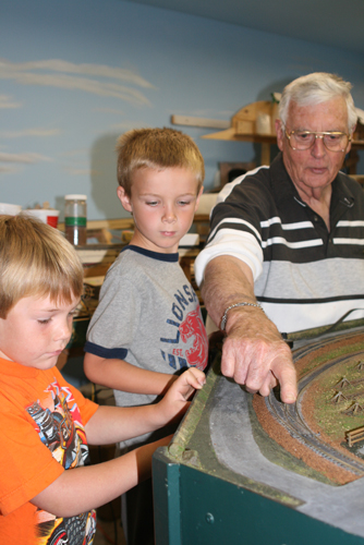At the end of the visit, great-grandpa gave them each their own engine and a piece of track. Talk about two happy little boys! They couldn’t believe that they actually got to take the train home 🙂