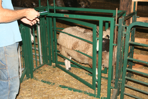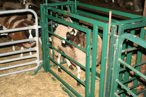 We have the 3-way chute set-up so we can sort the sheep into 3 separate pens. It can also be used as a squeeze – very useful for routine sheep care. This wouldn’t be possible for big breeds, but it works well with our jacob sheep.