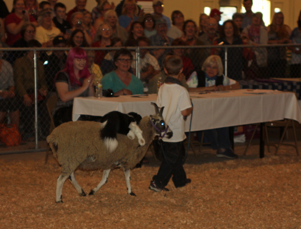 Yes, that is a Border Collie on Precious. Once again she has lived up to her name! The Border Collie is a puppet and a new item and he really wanted to take it in the ring with him. He came up with the idea of putting it on her back and I was a little skeptical…I thought she would freak out for sure. She didn’t even flinch! She just walked along like she has a stuffed animal tied to her back everyday 😉