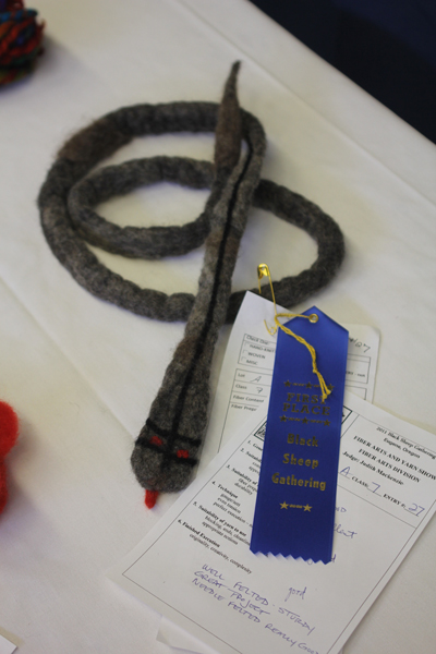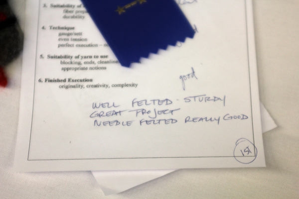 He started by wet felting the body and then he got creative with the needle felted add-ons. At the last-minute I remembered the Fiber Arts division and he entered it in the Youth Felted division.