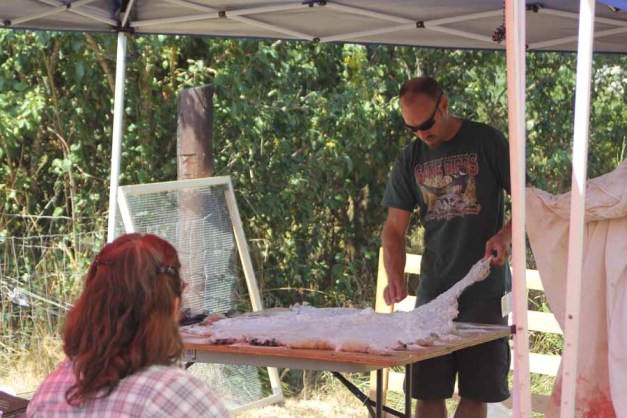 Saturday afternoon was full of workshops. My husband did a wonderful job on the basics of butchering workshop. Here he is demonstrating how to prepare the hide to be shipped off for tanning. We also had a sheep panel & skirting table workshop, dyeing workshop, and felting workshops. I had a blast with the felting workshops and I finally had to leave to meet the vet at the neighbors for the health certificates. The ladies were having so much fun they just couldn’t stop!