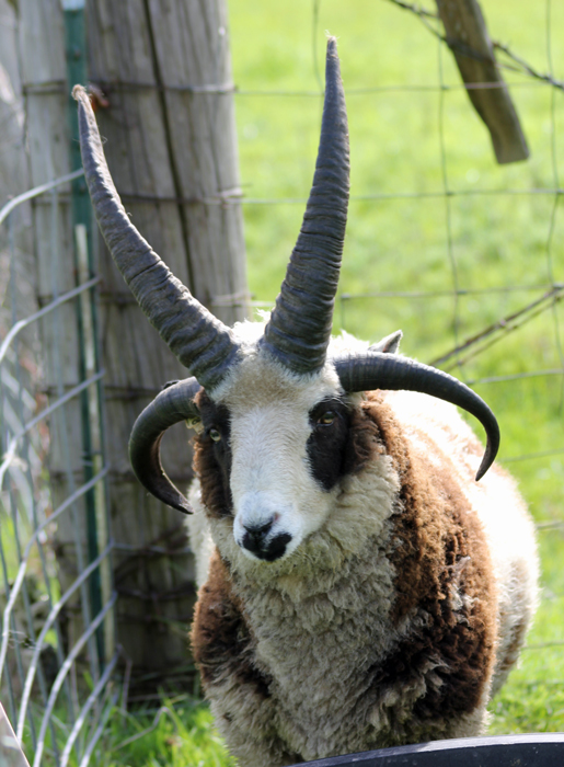 We are often asked how fast the horns grow on the Jacob sheep. People are often shocked to find out that you can see the horns on the ram lambs when they are born. The horns do a lot of growing from birth to 9-10 months, but the growth that really amazes me is in the Spring of their yearling year. Here are some pictures of Byeburn Hector showing just what I mean!
