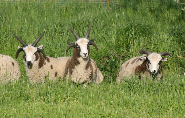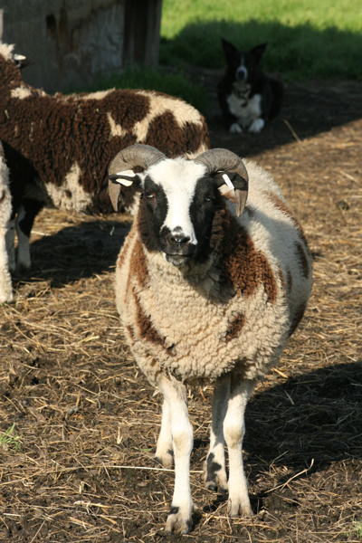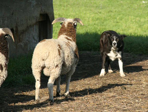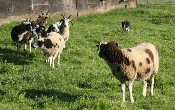 Joan at Mud Ranch is hoping to add a border collie to help with their sheep chores. They are going to get a trained dog, but the sheep need some training as well. Jacob sheep can be challenging for a dog, they like to intimidate and some do a little more than intimidate…especially when they have lambs. I offered to bring Kate with me when I came to visit and work with their sheep a couple of times. You can read Joan’s tale of the day on her blog.