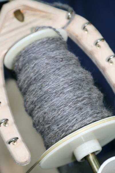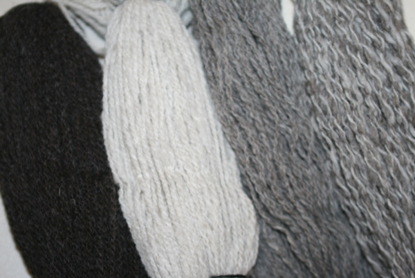 Here is what I have accomplished so far – it is amazing what you can do when you put your mind to it. There is a little over 12 ounces, 2-ply yarn in charcoal, lilac/white blended, dark gray, and a yarn I am calling lumpy, bumpy, and chunky in light gray and dark gray. My personal challenge was to spin every day and I am happy to say that I have done just that!