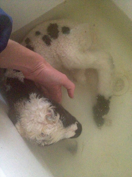in a warm bath! Another first for me 🙂 His whining stopped shortly after putting him in the warm water and he started perking up. I needed to get him dry…what’s the best way to dry a lamb, you ask….