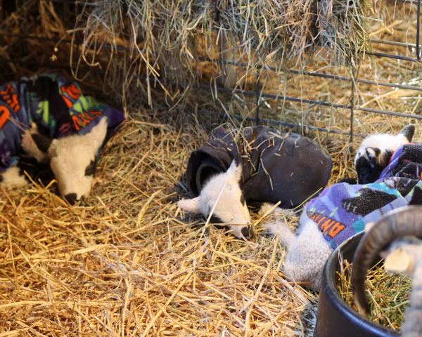 Once we got back to the barn, I gave the girls little fleece jackets too and made sure everyone was eating. I grabbed my scale to see just how small the little girl was – 5 pounds! Her brother and sister each weighed 9 pounds! No wonder she felt light. Here she is next to Broderick, the big boy born a few days earlier.